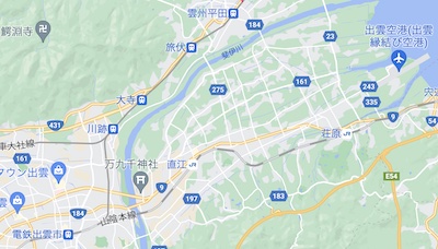 出雲空港・JR「荘原駅」・一畑電車「雲州平田駅」・出雲大社の位置関係は上図の通りです。
