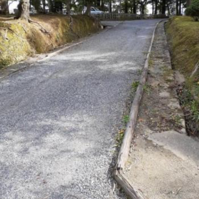 まず、松江城の通路の路面について確認しておきましょう。出雲大社の路面については、砂利舗装の中に車椅子が走行できる石畳舗装路があることを説明しましたが、松江城の通路は、階段以外の部分は全て未舗装で土面です。さらに部分的に、その土面の上に、車椅子の車輪が空転する砂利が敷いてあります。下図のような感じです。車椅子の車輪は低い方へ横滑りします。老老カップルでは下りは何とか動きますが、上りはとても動きません。