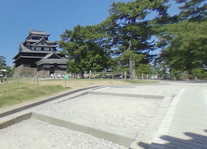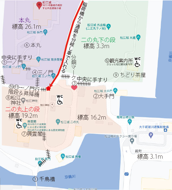 松江城は標高を基準に、二の丸下の段(標高2〜3m)・二の丸上の段(標高16〜19m)・本丸(標高25〜26m)・天守閣エリアに分かれ、それぞれのエリアに見どころがありますが、その間は階段で登る地形になっています。二の丸下の段にはちどり茶屋・ふらっと松江観光案内所・芝生エリアなどがあり、大手門から段差なし「(画像②大手門:坂道と飛び石があり)」で行くことができます。しかし、入り口(画像⑭大手門→飛び石→階段2箇所)には傾斜があり、途中に約2m幅の飛び石があり、車椅子走行には技術がいります。管理人も旅行者に助けていただきました。ここから二の丸上の段に進むには、「画像③二の丸上の段への手摺付階段」のような階段が2箇所あるので、車椅子ユーザーは別ルートを探しましょう。
