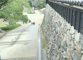 老老カップルにも使える一番優しい二の丸上の段への別ルートは、車で稲荷橋→馬洗池→三ノ門跡へ行き、帰路は馬洗池→北惣門橋から出るルートです。詳しくは車いすで行く松江城(アクセス編)をご覧ください。二の丸上の段へのには松江神社・興雲閣・三ノ門跡・トイレ・本丸への階段などがあり、大手門や千鳥橋から段差があります。車椅子ユーザーは事前に連絡をしておけば、稲荷橋から車で入り、二の丸上の段の三ノ門付近まで行くことができます。そうすれば、二の丸上の段を散策することができます。管理人はこの方法を使いました。8:30を過ぎたら、宿泊先から電話をしてこの方法の許可を取り、タクシーで二の丸上の段の三ノ門付近の臨時の駐車場(トイレ棟の後ろにある)まで行きました。しかし、ここから城内道路へ脱出するのも体験で、犬の散歩をしていた市民の方の助けを借りました。