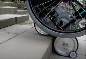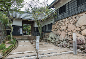 車いすを利用のまま、本丸エリアまで上がる方法が一つだけますが、今はコロナ対策で休止されています。その方法は二ノ丸上の段よりスタッフによる石段昇降(画像⑪ 一の門への階段昇降機、人力持ち上げもあり)のお手伝です。但し、利用の際は必ず予約が必要です。天守閣のあるレベルの本丸に上がるためには、車いすを人力で持ち上げるか、階段昇降機を利用することになります。事前に松江城(TEL.0852-21-4030)に連絡が必要です。階段昇降機は「スカラモービル」が使用されています。