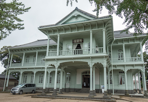 トイレ棟後ろの砂利引きの広場を出て、上がって行くと、右手に本丸エリアへの階段が見え、さらに進むと、松江神社・興雲閣が見えてきます。松江神社(画像⑧縁結びの地の松江神社の絵馬はハート型)は道路との境界に段差があり、拝殿前には階段があります。興雲閣(画像⑦興雲閣は明治天皇の行在所の為に建てられた)の前は深い砂利舗装で、管理人もアクセスを試みましたが、車椅子が前に進みませんでした。ここで引き返し、介護者のみ、本丸エリアに行き、簡易人は三ノ門跡周辺で待機していました。