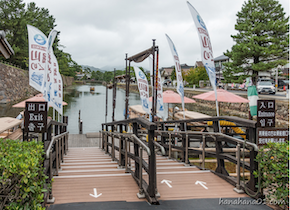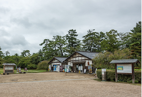 ほぼ見終わってトイレに行こうと思いましたが、トイレ棟(画像⑩二の丸上の段へのバリアフリートイレ)は、松江神社・興雲閣・本丸への階段など前の通路より下にありますので、ここからアクセスするには、2ヶ所ある階段を降りるか、後ろにある仮駐車場の深い砂利の斜面を下らなければなりません。「行きは良い良い帰りは怖い」ではないですが、自力では帰れません。二の丸下の段では、堀川ふれあい広場に車椅子対応トイレがあります。ここでは休憩もでき、車椅子乗車が可能な松江レイクラインのバス停もあります。