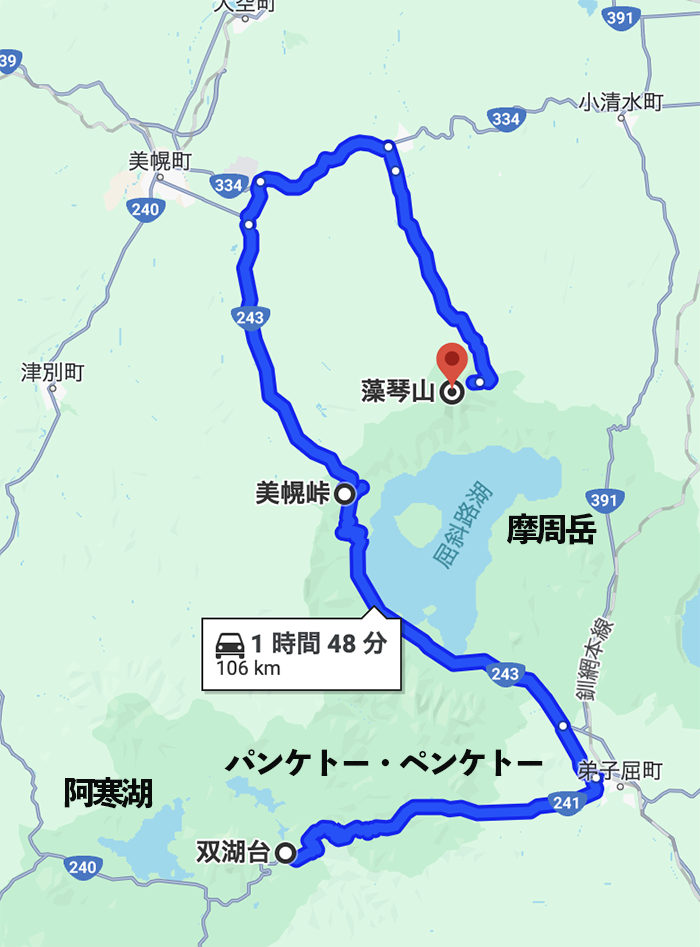 ▽阿寒連峰のバリアフリーの宿はホテルひがしもこと・ピュア・フィールド風曜日などがあります。ホテルひがしもことはこのルートの途中にあり、藻琴山まで約20分(約20km)・ピュア・フィールド風曜日はこのルートの途中にあり、双湖台まで約30分(約30km)です。