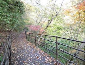 全長約2.5kmに及ぶ「鬼の舌震」には、下高尾駐車場から下流に向けて約600mの区間バリアフリーの遊歩道が設けられています。遊歩道はなだらかで、車椅子や高齢者の方でも安心して進むことが出来ます。なだらかな遊歩道を車いすで行くと、バリアフリーの遊歩道の終点にある、回転場所でUターンとなります。