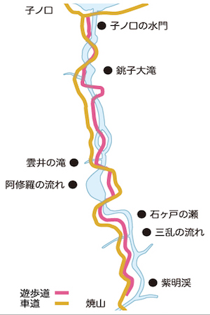 奥森吉野性鳥獣センターで奥森吉の情報を入手することができます。立川親水ゾーンとして川沿いに巡らした遊歩道の一部は、車イス対応のバリアフリー(一周800m)になっています。400m先の立川橋の分岐を直進するとノロ川園地(休憩所、車イストイレ)で、桃洞渓谷へは橋を渡りノロ川遊歩道に入ります。