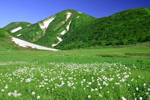 磐梯朝日国立公園の天狗の庭・福島県の高湯温泉と土湯峠を結ぶ有料道路沿いの福島市内が遠望できる「天狗の庭」から、一面に芽生えた新緑の木々、雄大な火打山を見ることができます。あまりの美しさに天狗が舞い降りて遊んだという言い伝えから、「天狗の庭」と呼ばれるようになったそうです。