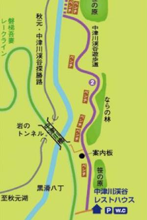 中津川渓谷に架かる中津川橋に入った瞬間、鮮やかな新緑が目に飛び込んできます。橋の上では路駐できませんので、橋のすぐ側にある中津川レストハウス駐車場に停めましょう。 駐車場の裏手に中津川橋から渓谷へ続くレークラインの橋の下から秋元湖サイクリングロードの奥の車止めまで遊歩道があり、未舗装で階段もあります。10分弱ほど遊歩道の階段を下りて行くと、中津川渓谷に出ます。車いすでの移動は難しいですが、中津川橋の上から見たような鮮やかな新緑を見ることができませんので、橋の上から眺めれば十分です。
