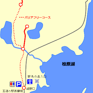 パネル展示のある細野口休憩舎と駐車場にトイレが整備してあります。休憩舎から遊歩道に入ると、湿原の上を木橋のような道が整備されていて、湿原にさく花を楽しめます。時間をかけてゆっくりと自然観察をするのにとても良いところだと思います。しばらくは湿地帯の中をウッドチップを引きつめ固めたバリアフリーの遊歩道が続いています。それが木道にかわり、湿地帯を抜けて沼の当たりまで車いすでいけます。