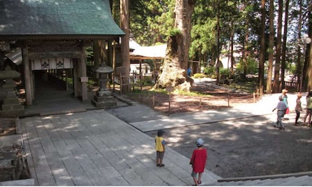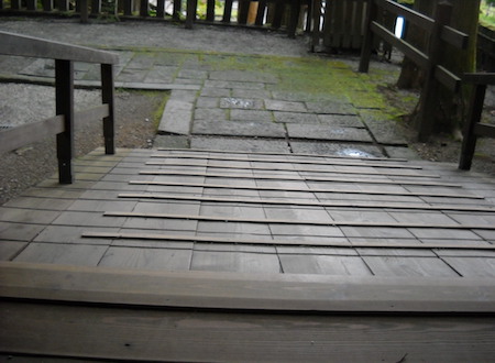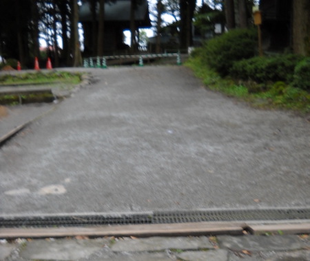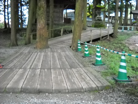 北参道側の鳥居前の様子です。鳥居を潜って正面の社殿へと続く階段を上ると拝所への近道ですが、車椅子の人は左側へ進み、天流水舎と呼ばれる雨乞いに使われる建物、江戸時代の太鼓が見られる神楽殿、推定樹齢1000年ともいわれる大ケヤキ、ハート形に見える猪の目型の石灯籠などなど、さまざまな見どころがあります。さらに180度折り返し布橋を通って進むと、前記の階段を上がった場所に合流します。この簡、大きな障害箇所が2箇所・小さな段差が4箇所あります。