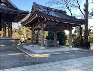 本堂の前までバリアフリー通路を進みます。五重塔、手水舎、鐘楼が並ぶ配置で、五重塔と手水舎の間にバリアフリーカート道が伸びています。本堂前からバリアフリーカート道を右折すると、手水舎に近づきます。手水舎は砂利路面を通り、段差がある構造です。車椅子で手を浄めるのは介助が必要です。