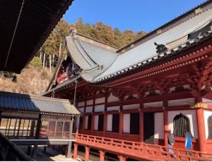 バリアフリーカート道を通り、本堂前に再度移動します。正面が本堂、右隣が「祖師堂」です。お堂に沿ってバリアフリーカート道が整備されています。本堂の正面は段差構造です。新エレベーターを利用すると上部の回廊に車椅子で移動できます。祖師堂の前の香炉は車椅子でお参りが出来る構造です。祖師堂の正面の見事な装飾を、バリアフリーカート道から観覧できます。報恩閣の前を通ります。大きなしだれ桜があり、下の池には鯉が泳いでいます。バリアフリーカート道は、日蓮聖人が眠る御真骨堂拝殿の横を通ります。更に仏殿の前まで、バリアフリーカート道は続きます。バリアフリーカート道から、仏殿の見事な彫刻を見上げることができます。バリアフリーカート道は、釈迦殿新納牌堂方面へも伸びています。しだれ桜を近くから観桜できます。そして大客殿の前で、バリアフリーカート道は突き当たりになります。バリアフリーカート道を本堂方面に引き返します。この角度からもしだれ桜が楽しめます。