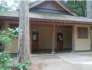 鳥居をくぐって左手にトイレ(写真③)があります。193段ある石段(写真④)を上った後は参拝者用のトイレがありません。