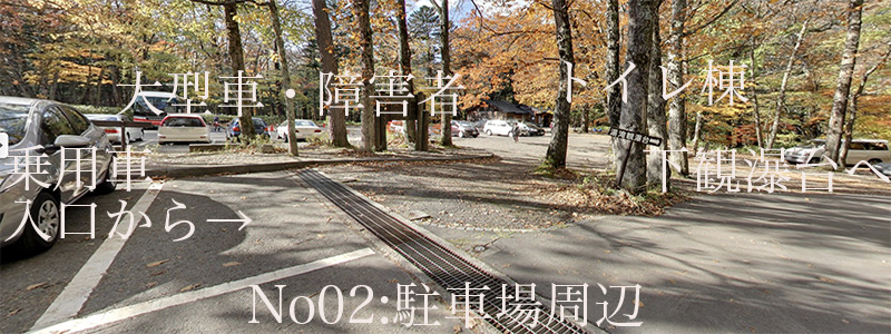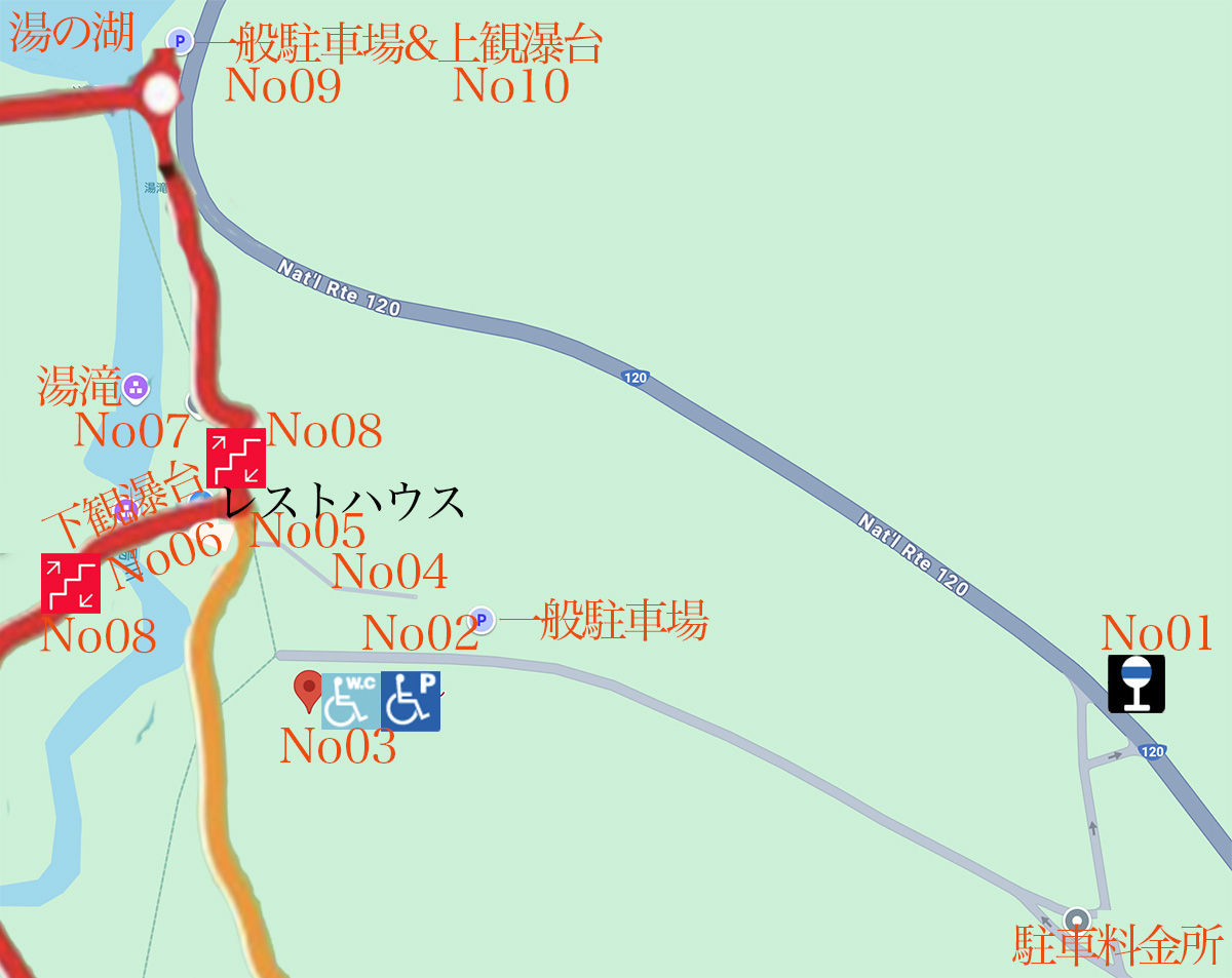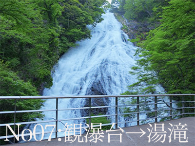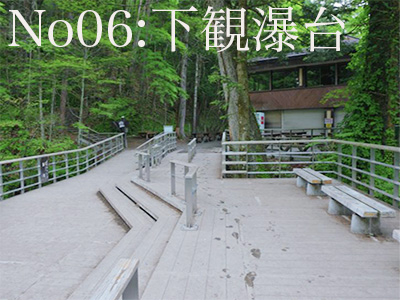 滝壺(滝下観瀑台)と幹線道路が海抜同レベルにあり、歩行距離もバス停「湯滝入口」から滝下観瀑台まで平坦な道を500m、一般駐車場から滝下観瀑台まで平坦な道を150mです。老々カップルの車椅子使用者でも、滝の飛沫や音を十分楽しめます。滝を上から見下ろせる上部観瀑台もありますが、ここにバス停は無く、約700m間の平均勾配5%もり、歩道が無く、道路の両端は車椅子が走行できる路面ではありません。