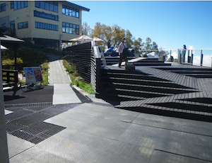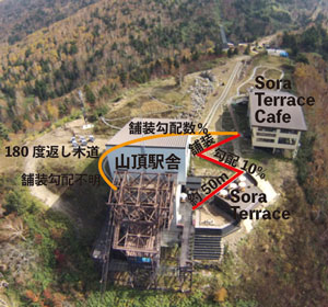 竜王ロープウエイの山頂駅は、ゴンドラとプラットフォーム間に段差がなく、通路は出口まで全てフラットで車椅子で移動できます。出口は正面と左側の2箇所があります。正面出口を出ると、未舗装通路・螺旋の木道が続きT字路になり、左側はお花畑に下ります。右に行くと「Sora Terrace Cafe」に行くことができますが、約10%の勾配を60mほど走行することになります。左側出口はすぐにテラスに繋がっています。外に出ると、右側にテラスに行く小さな階段とスロープがあり、正面には「Sora Terrace Cafe」に行くことができる勾配が約10%くらいの舗装路があります。