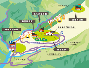 第1ロープウェイ・鍋平高原駅と第2ロープウェイ・しらかば平駅との乗り換えする場合には、専用のスロープ通路を利用して第2ロープウェイのホームに直接行くことができます。