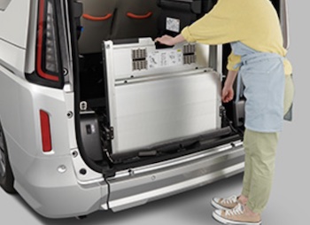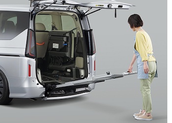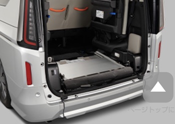 JPN TAXI(ジャパンタクシー)の傾斜度はスロープNo.1が10度(17.6%)、スロープNo.2が14度(24.9%)です。この勾配は「高齢ドライバーや女性ドライバー」にはかなりハードルが高いと考えます。一方、ニッサン セレナX DAA-GC27の傾斜度は11度(19.4%)で、昇降能力120kgの乗降アシスト装置(電動ウインチ)が搭載されております。その結果、運転手は走行の安全性を監視するだけです。両社の標準床高・スロープ長さが同じなのに角度が異なるのは、ニッサン セレナX DAA-GC27はニーリングで乗降時床高を80cm下げているためです。