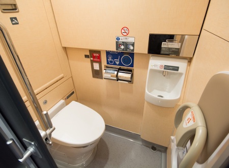 この区間の乗車時間は概ね4時間になります。そうすると、適切な座席の確保と共に、障害者でも使えるトイレの確保が必須になります。多目的トイレは普通車2号車(左側写真)とグリーン車9号車(右側写真)の2両だけに、手すりがあり杖を突いて歩ける障害者なら使える一般トイレは1号車・4号車・6号車・8号車・11号車です。指定席と壁との空間に車椅子を置くことができ・一般トイレが近い車両は、下り列車の場合、2号車(1号車トイレ)・5号車(4号車トイレ)・7号車(6号車トイレ)・12号車(11号車トイレ)の1列目の席です。上り列車の場合、1号車(1号車トイレ)・4号車(4号車トイレ)・6号車(6号車トイレ)・11号車(11号車トイレ)の12列目の席です。