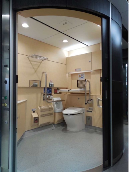 この一般トイレは引き戸の内側に手すりがあるほか、壁などにもう一方の手を添えれば、杖歩行者でも十分使えます。また、管理人は列車が駅に到着後すぐに席を立って、列車が揺れて居ない状態で用を足します。