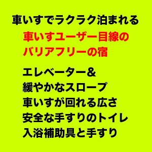 パートタイム車いす利用者が館内を車いすで移動でき、一人で入浴できる入浴補助具があるバリアフリーの宿やフルタイム車いす利用者が館内を車いすで移動でき、車いす入浴ができるバリアフリーの宿、観光地情報を提供しています。